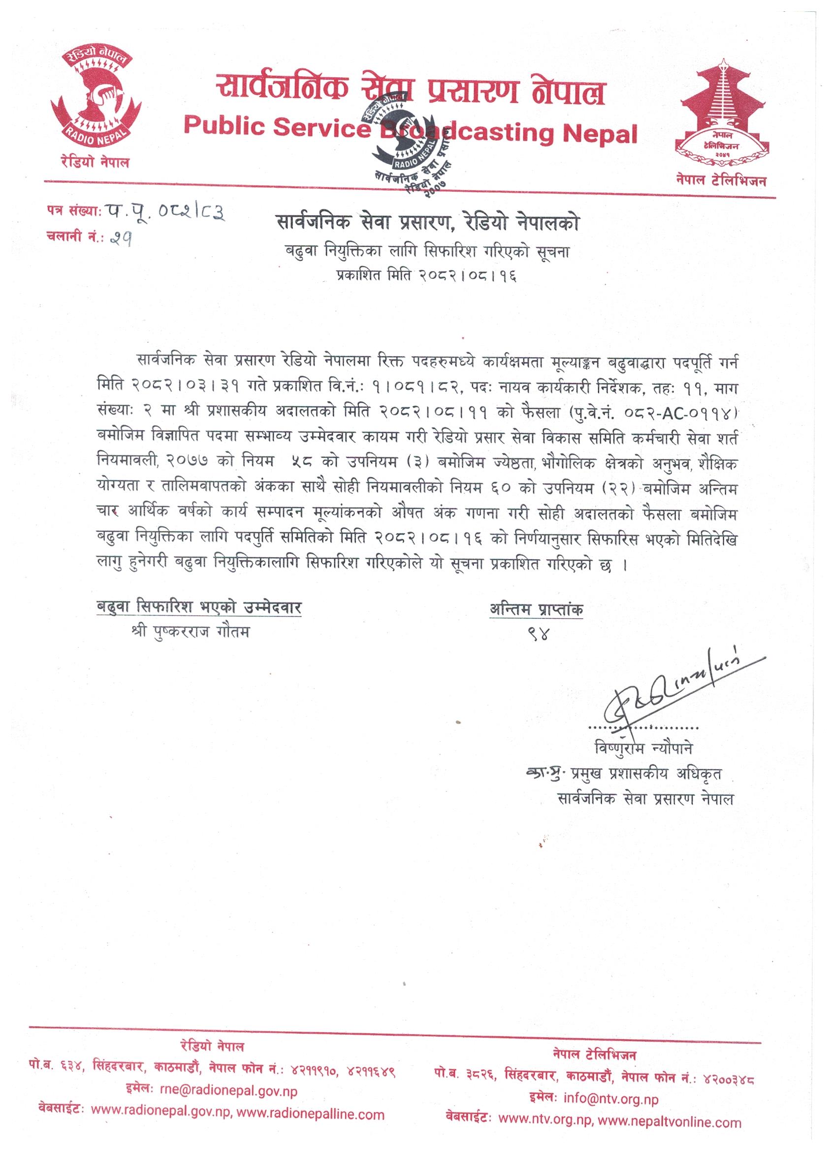 बढुवा नियुक्तिका लागि सिफारिश गरिएको सूचना !